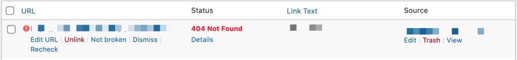 When you let the mouse hover over one of the rows in the broken links table, you’ll see a number of actions that will help you fix or remove the broken link quickly.